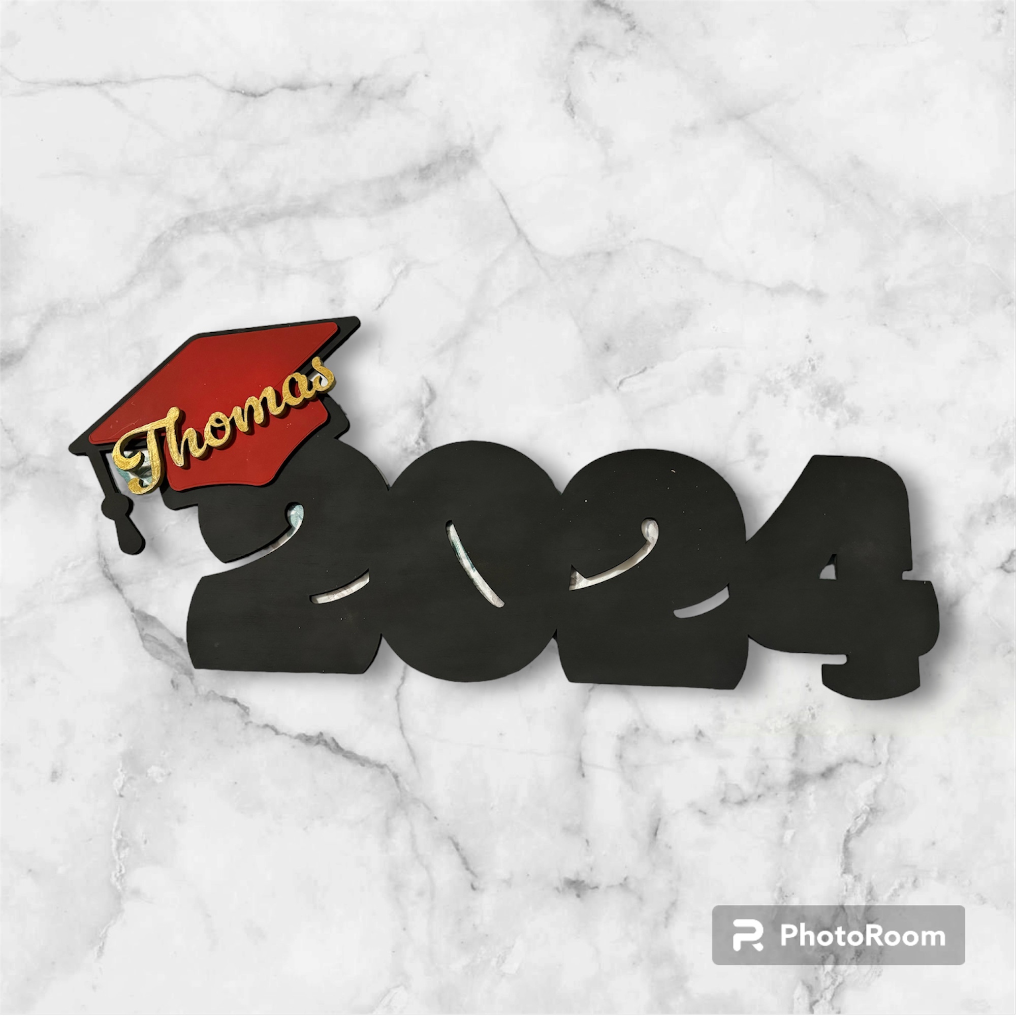 Unique 2024 Guest book for your graduation Party. Sign is 23: wide made of 6mm basswood, the cap and name are laser cut from 3mm bass wood. The cap and name color are customizable